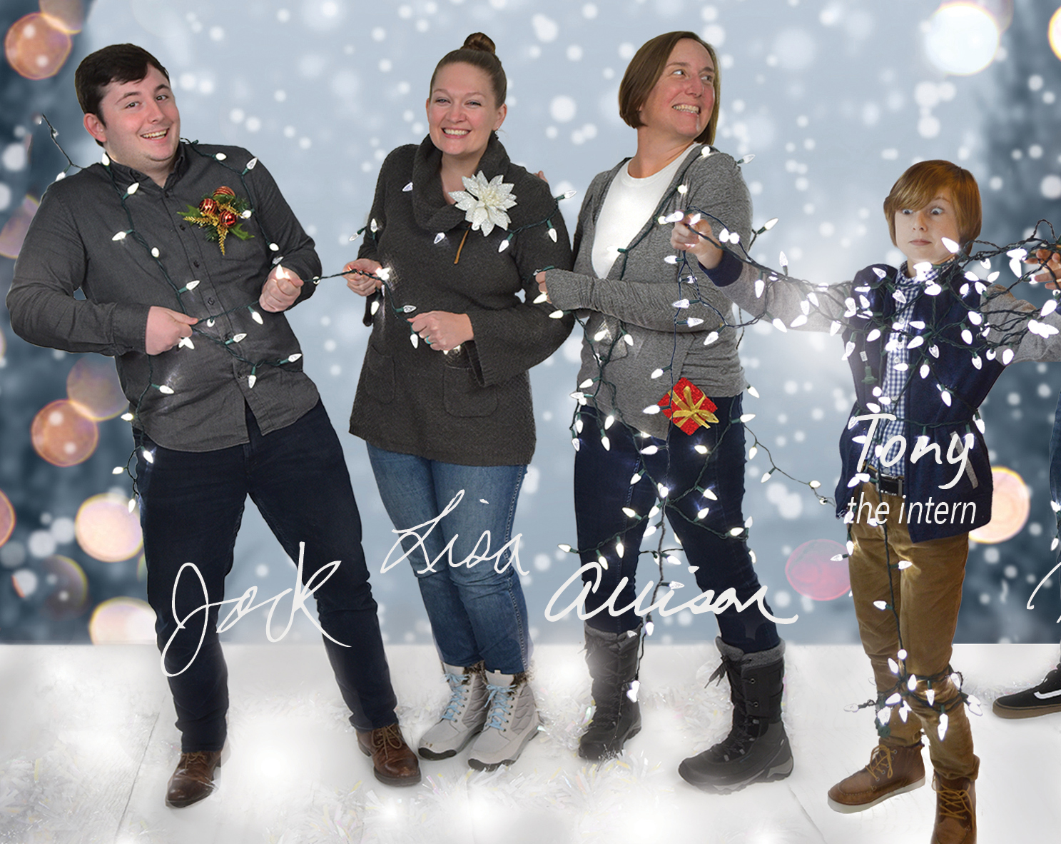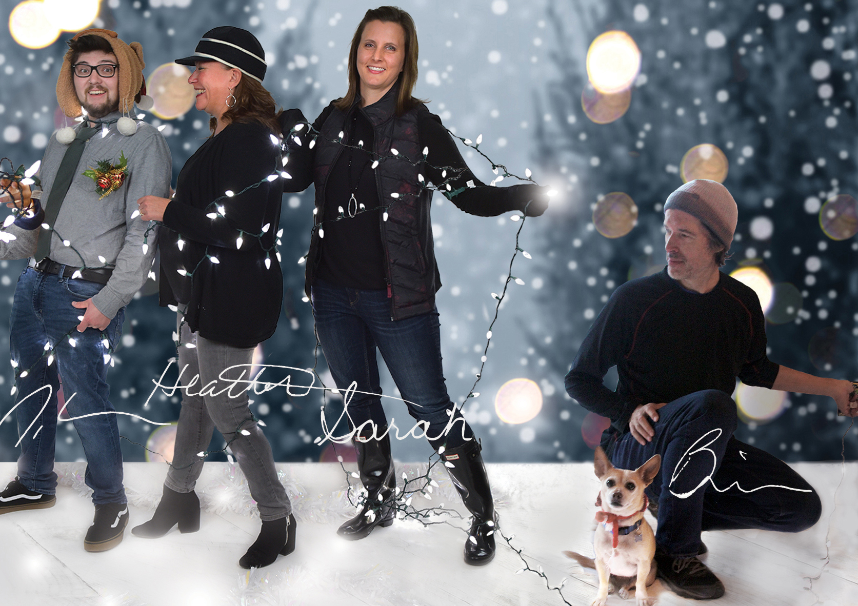 Our design process began with brainstorming involving the entire staff. Eventually, the concept of “Keeping the Holidays Bright” rose to the top and a vision formed of the entire staff – including our programmer who works from New Mexico and then intern – wrapped up in holiday lights.