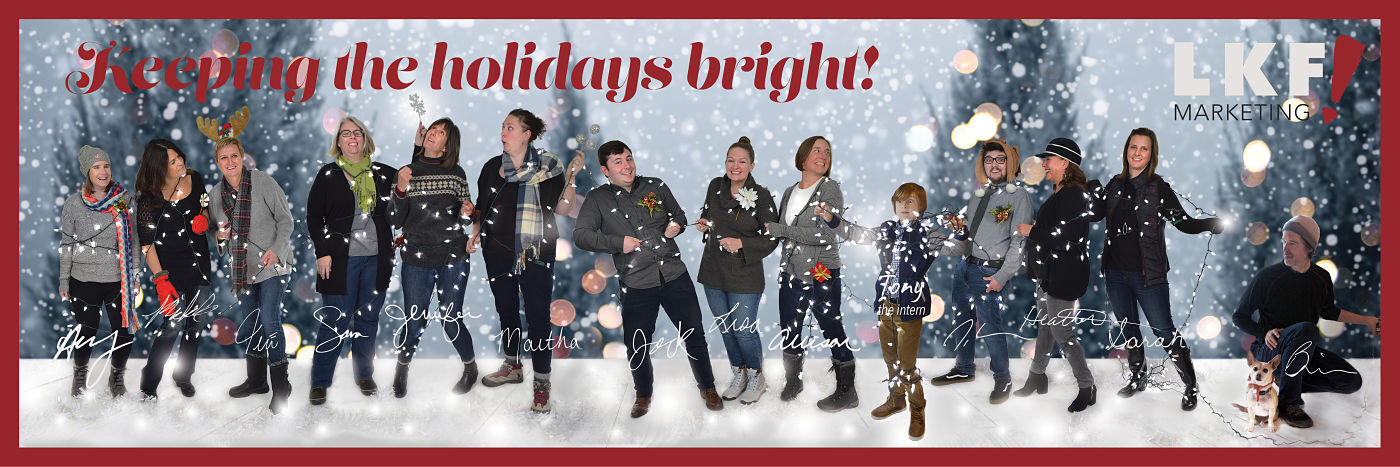 Here at LKF Marketing, the planning for our annual holiday greeting starts early. Like September early. Each year we are challenged to outdo the previous year’s offering while balancing the opinions of 15 experienced marketing professionals; show off our work hard, play hard culture; and send sincere wishes for a happy holiday season.