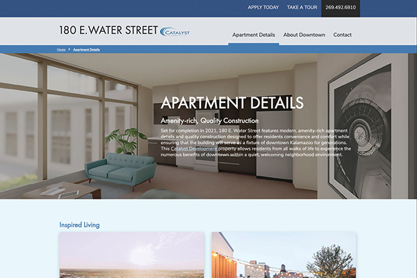 Created using our trademarked McConimore® WordPress theme, 180 E. Water Street’s website was developed quickly, efficiently, and within Catalyst’s budget. Property renderings, an amenities list, and an interactive map of downtown Kalamazoo courtesy of the Kalamazoo Downtown Partnership were used to give prospective residents an understanding of 180 E. Water Street and the inviting neighborhood housed within and around it.