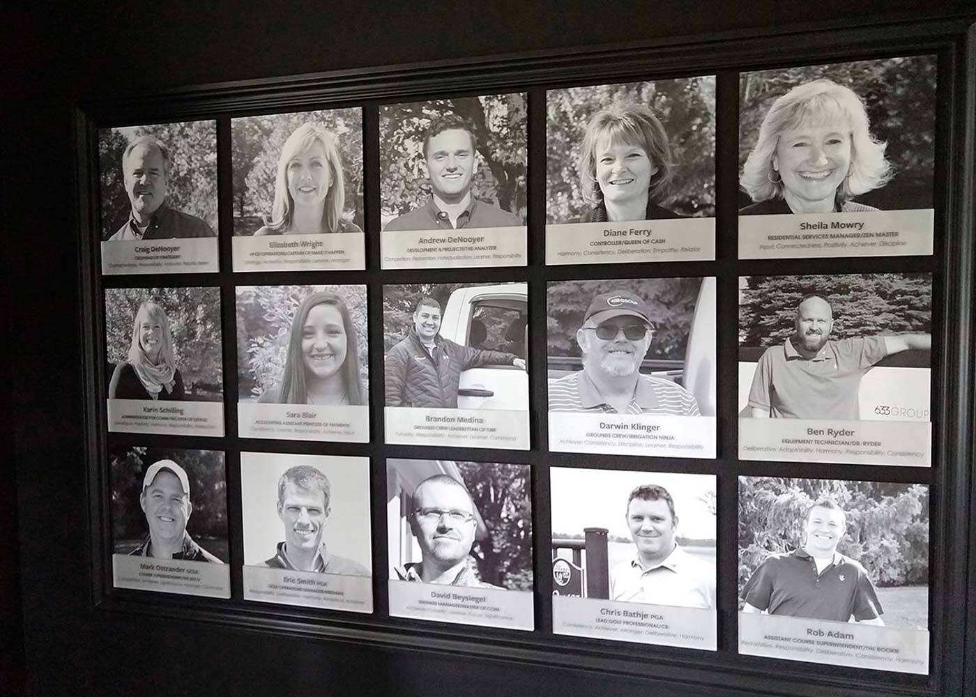 We opted to create a 3D, CNC-cut version of their logo, centered above a photo gallery of the 633 staff. The individual staff images were pulled from staff bios and treated with a black and white filter before being printed on acrylic boards and affixed with a frosted, acrylic nameplate in order to add an element of texture.