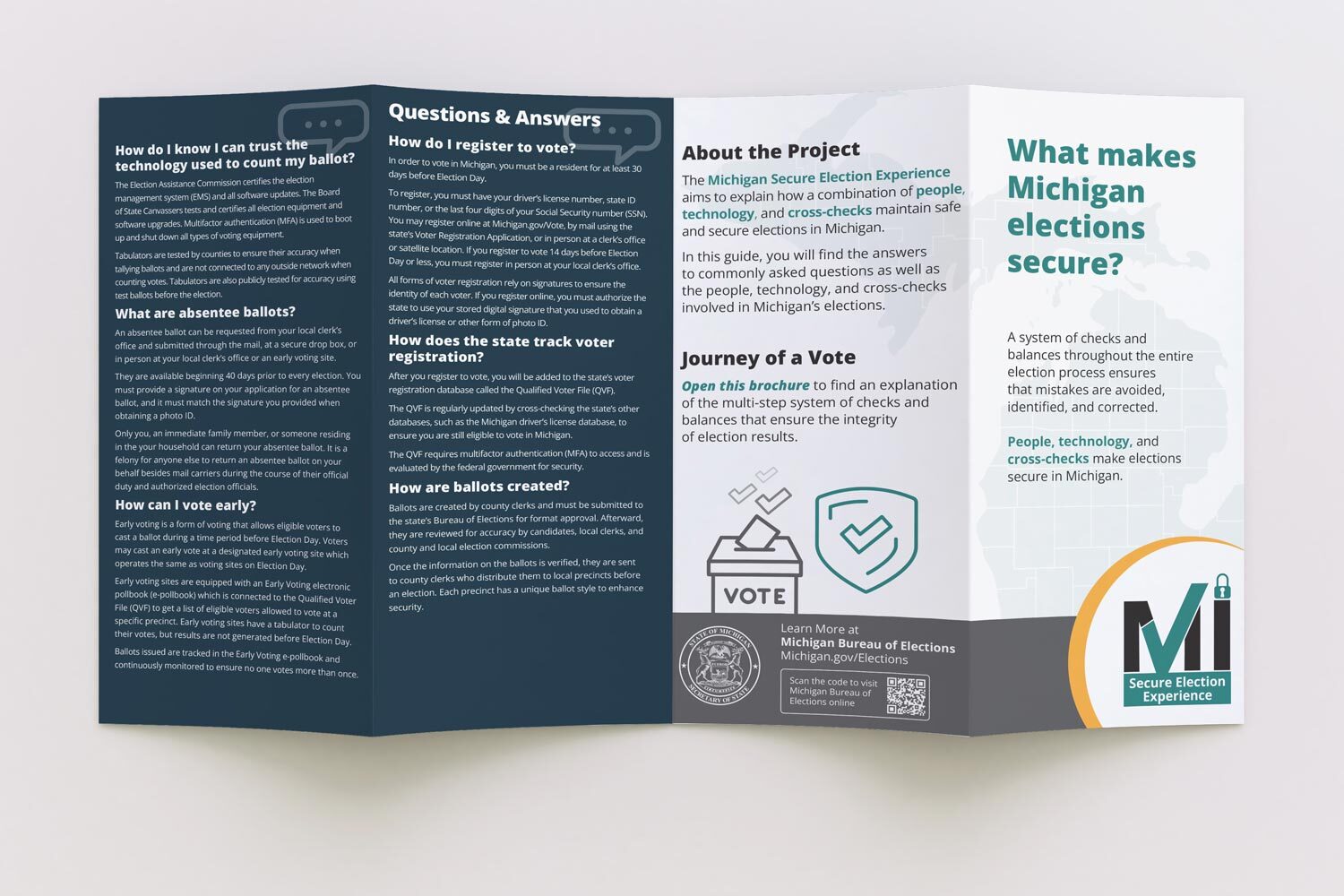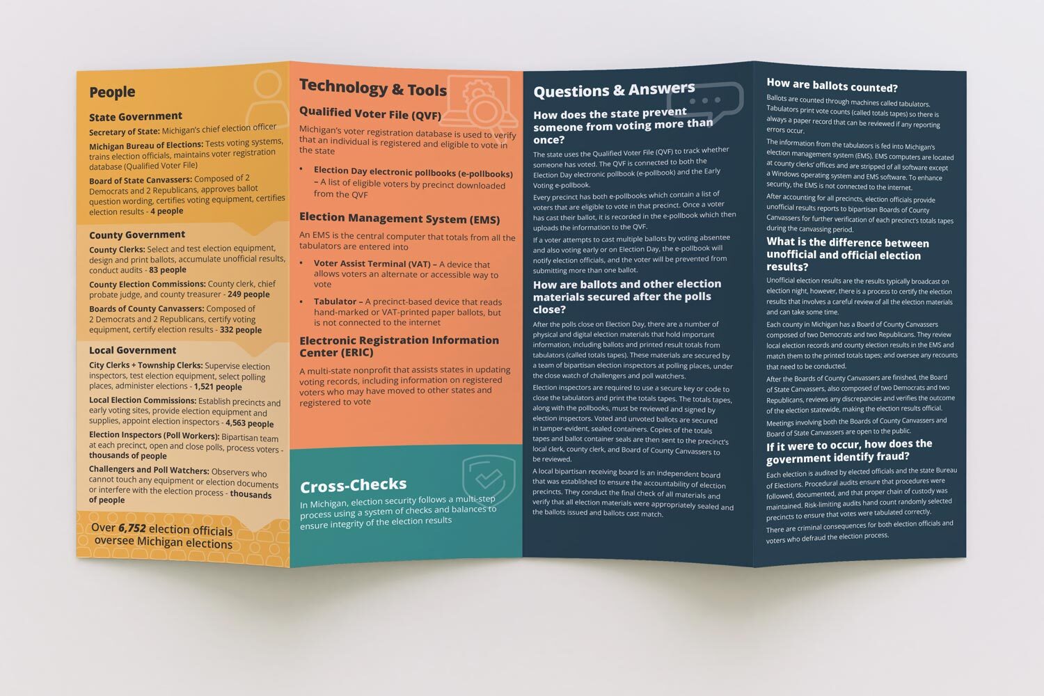 Created as a take-home tool for Michigan Secure Election Experience event attendees, the pocket guides contain a synopsis of key election information to reinforce event topics and messaging. Available in two formats, the booklet and brochure versions of the pocket guides are ideal for use as handouts or as a substitute for posters when space and setup time are limited.