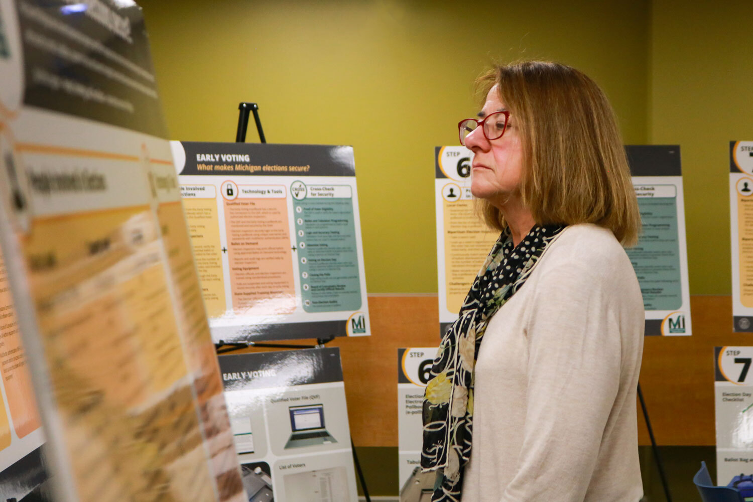 Posters highlight security measures during proof of voter eligibility, ballot and tabulator programming, logic and accuracy testing, absentee voting, early voting, voting on election day, closing the polls, unofficial election results, review and certification of official results by canvassers, and post-election audits.