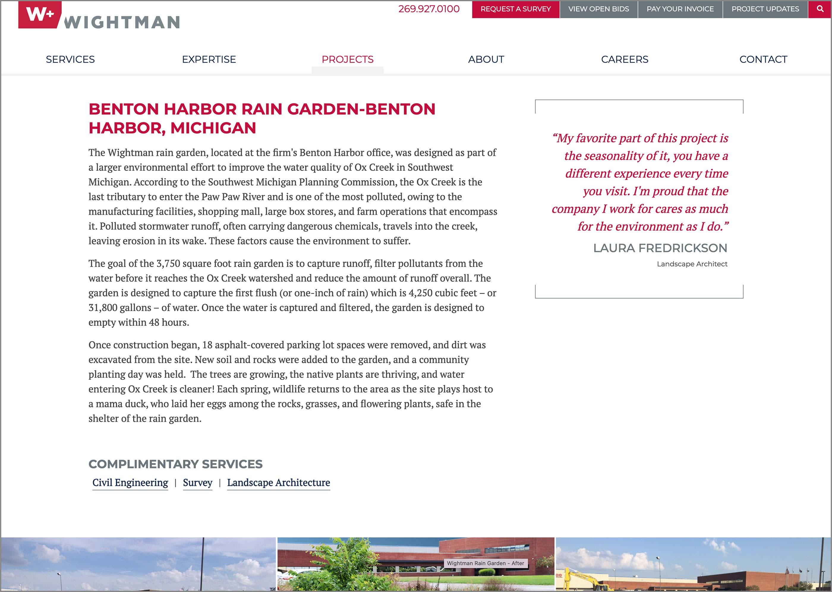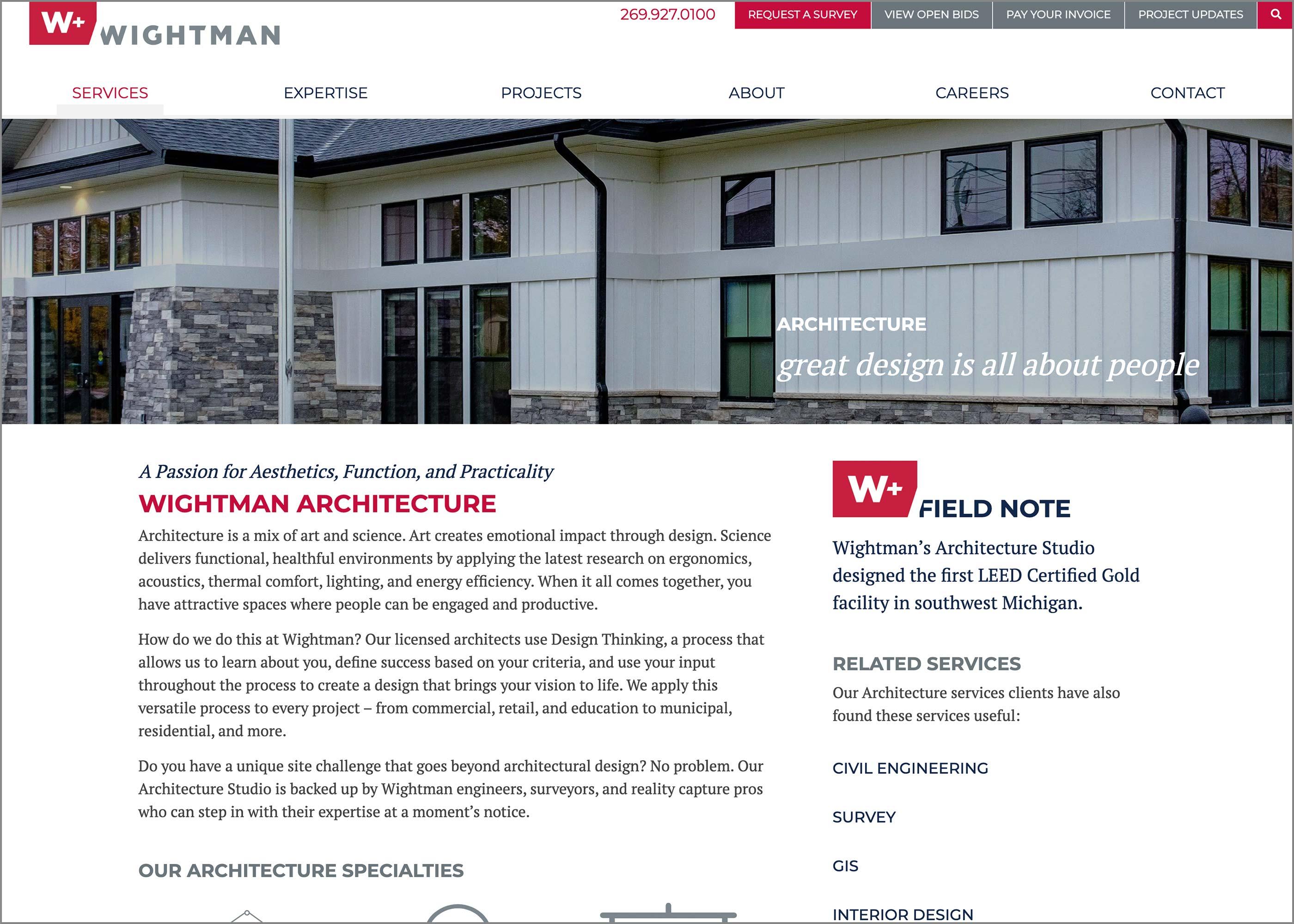 When designing the new site, LKF took care to ensure that users could easily access each of Wightman’s number of key disciplines. In order to accomplish this, LKF created an individual page for each discipline, Architecture, Survey, Landscape Architecture, Engineering, GIS, Planning, Environmental, Interior Design, and Reality Capture.