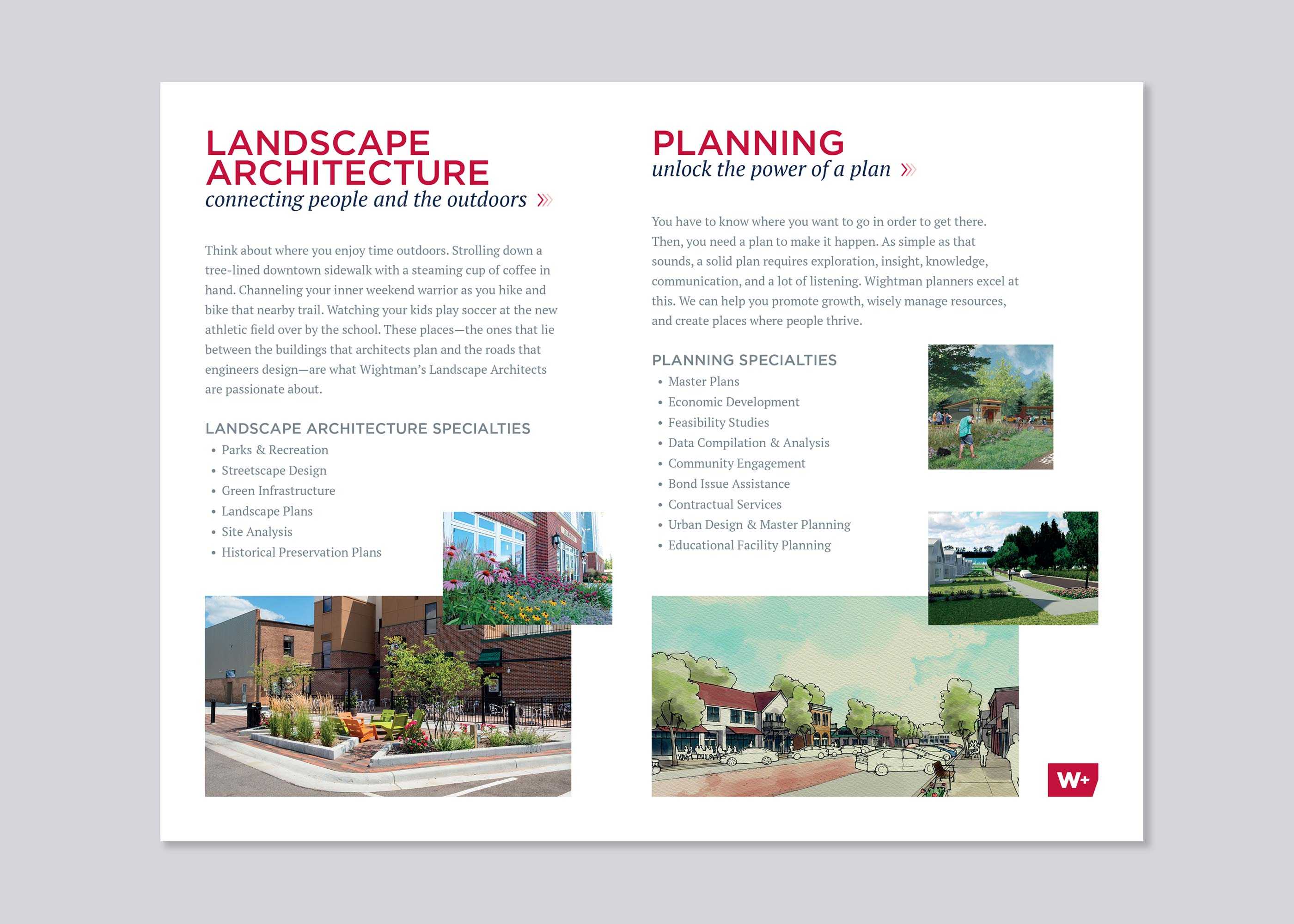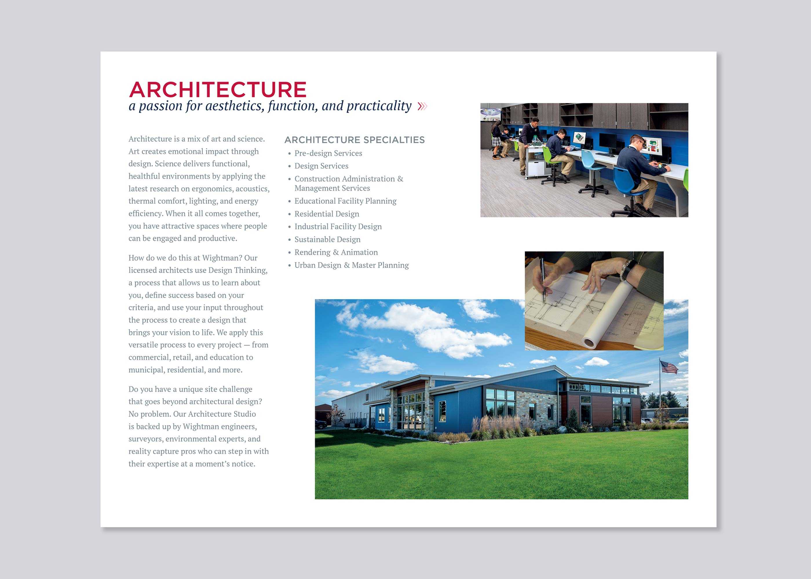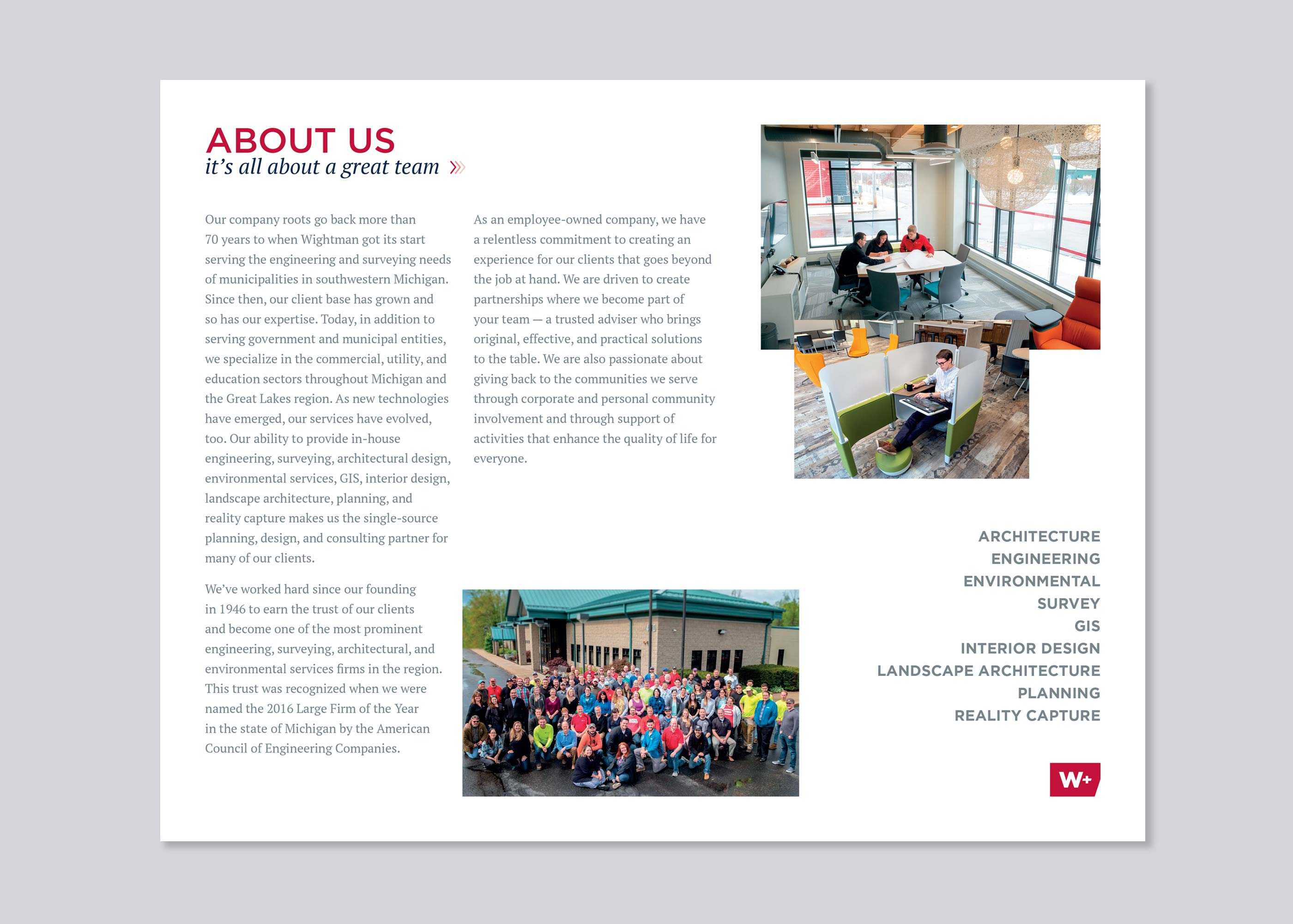 Wightman’s four areas of expertise, Commercial, Education, Government, and Utilities, and contact information round out the brochure’s content with strong calls to action.